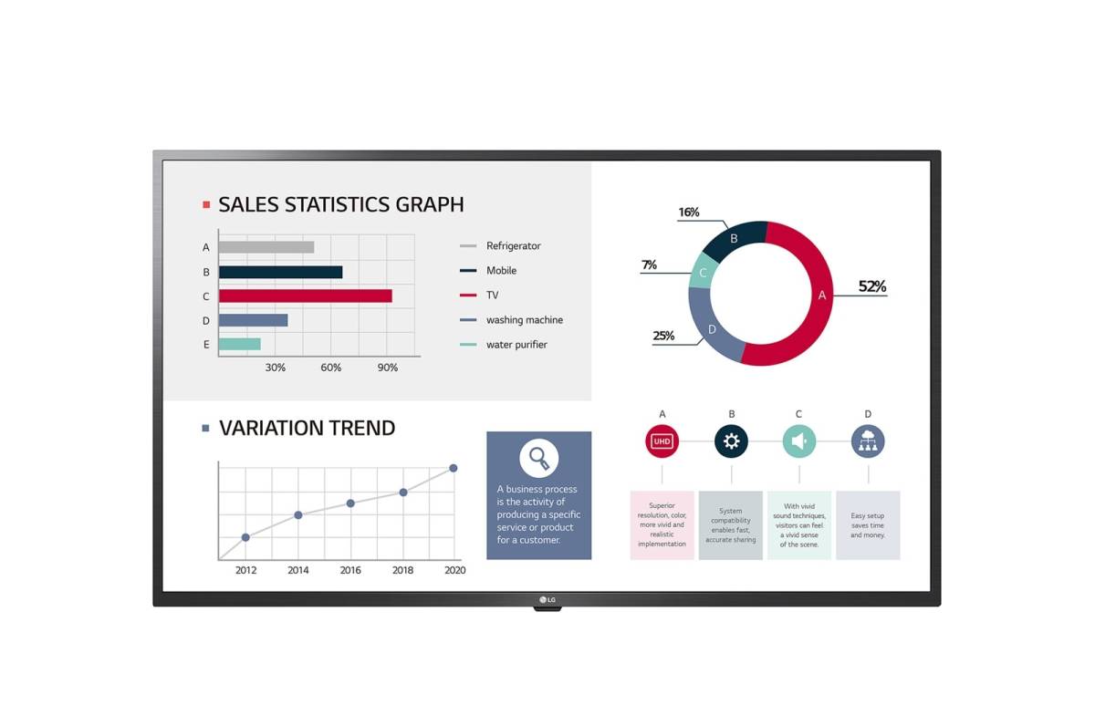 Le UL3J de LG est un écran professionnel pouvant répondre à différents usages. Il peut être utilisé, par exemple, dans vos salles de réunion pour réaliser vos réunions et projeter vos présentations ou en affichage dynamique pour diffuser du contenu. Il est adapté à toutes les utilisations.